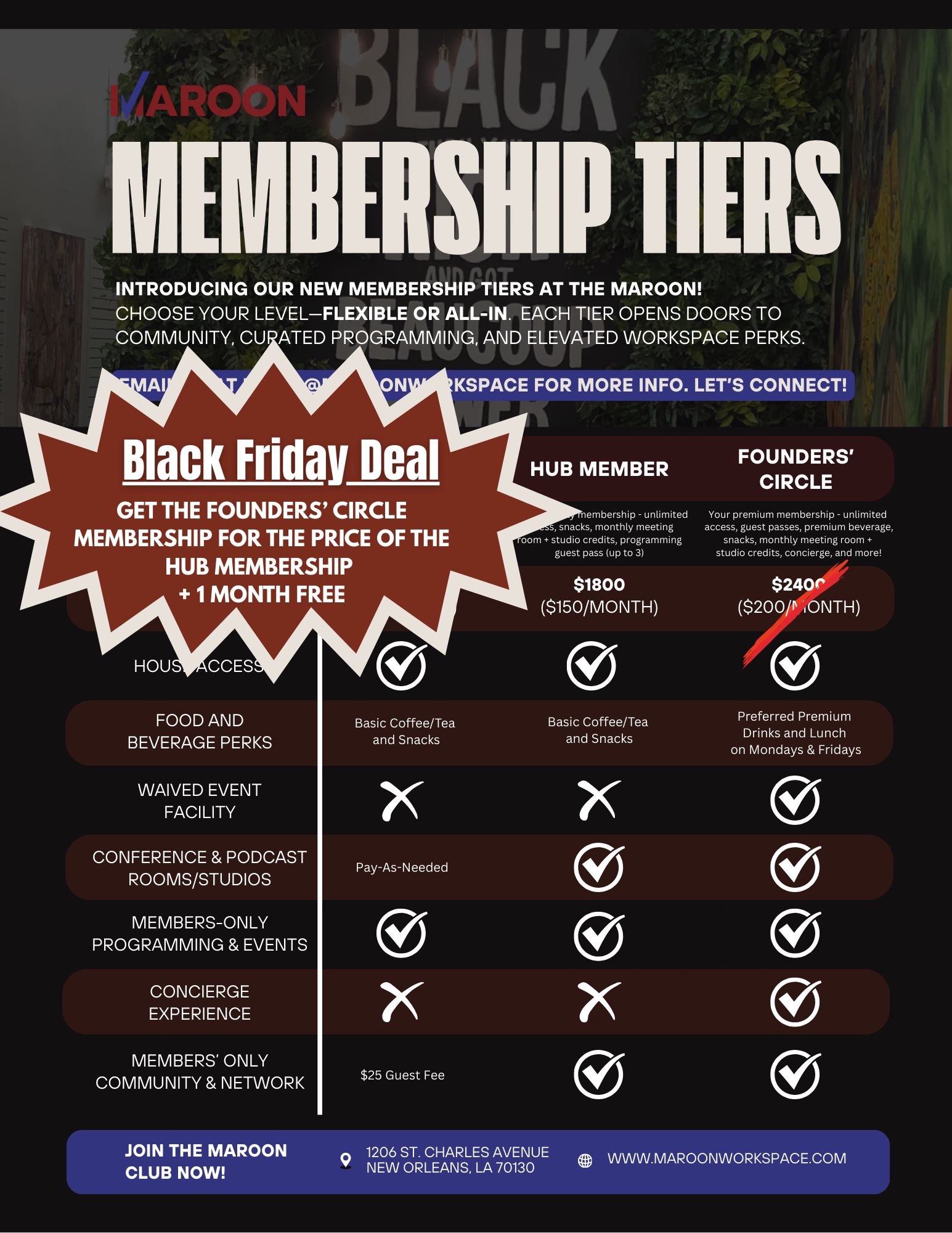 Based in the heart of New Orleans, Maroon is built to reflect the black local culture and community with an accessible location.